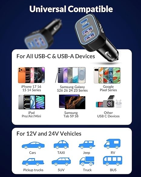 Universal Compatibility: Multiport USB type c car charger compatible with iPhone 17 17e 17 Air 17 Pro Max16e 16 15 14 13 12 11 Pro Max Plus, iPhone Air, iPad Pro Air mini, Samsung Galaxy S26 S25 S24 S23 S22 Ultra, Google Pixel 10 9 8 7 6, MacBook Air Pro M4 M3 M2 M1, LG, Moto, Android Phones, Laptop, smartwatches, driving recorder, GPS navigation, Android Phones and other devices