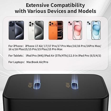 2Pack USBC iPhone Chargers Widely Compatibility : This USB C fast charger block offers 45W fast charging for iPhone 17/17 Pro/17 Pro Max/Air/16/16 Pro/16 Pro Max/16 Plus/16e/15/15 Pro/15 Pro Max/15 Plus, 2022/2021/2020/2018 iPad Pro 12.9/11 inch 6th/5th/4th/3rd, iPad 10th Generation, iPad Air 5th/4th, iPad Mini 6 and more USB C device