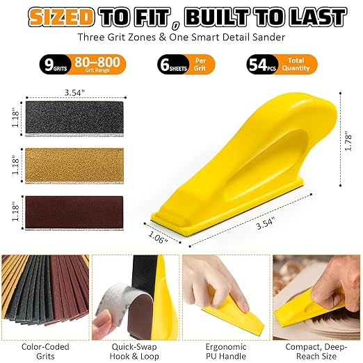 All-in-One Sanding Kit for Every Detail: Includes a compact sanding block and 54 sandpapers in 9 grit types (80/100/120/150/180/220/240/400/800) – perfect for detail sanding, micro finishing, and hard-to-reach areas.
