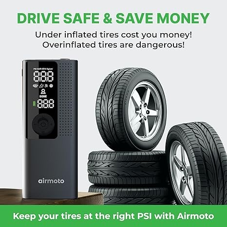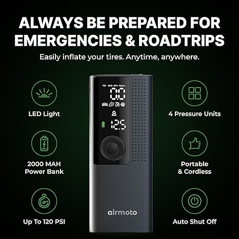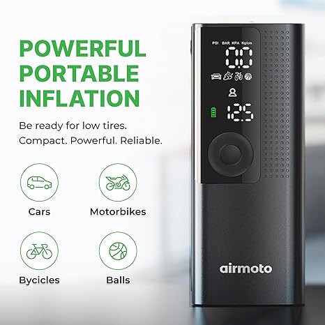 Airmoto Tire Inflator Portable Air Compressor - Air Pump For Car Tires with Digital Pressure Gauge, LED Light and Auto Shut-Off Function - Cordless Pump for Car, Motorcycle, Bicycle, Ball
