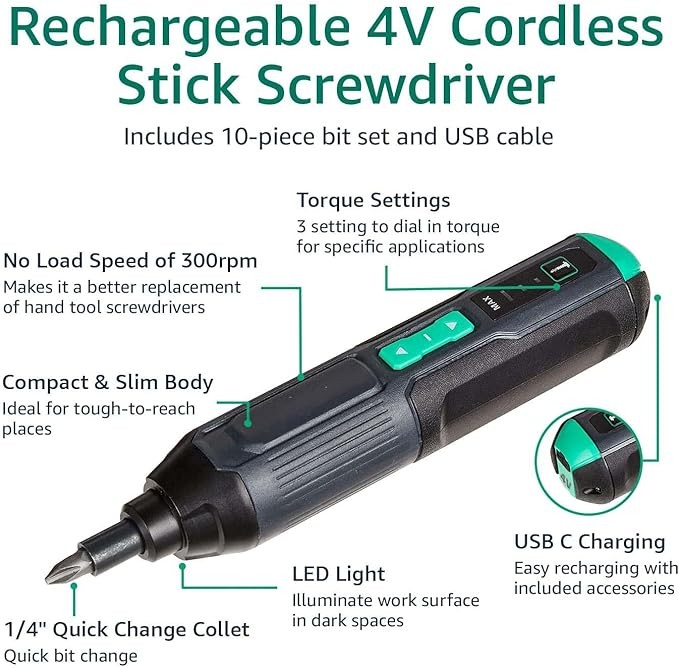 Amazon Basics by SKIL 4V Cordless Stick Screwdriver with 10-Piece Bit Set, USB Cable, LED Light, 3 Torque Settings