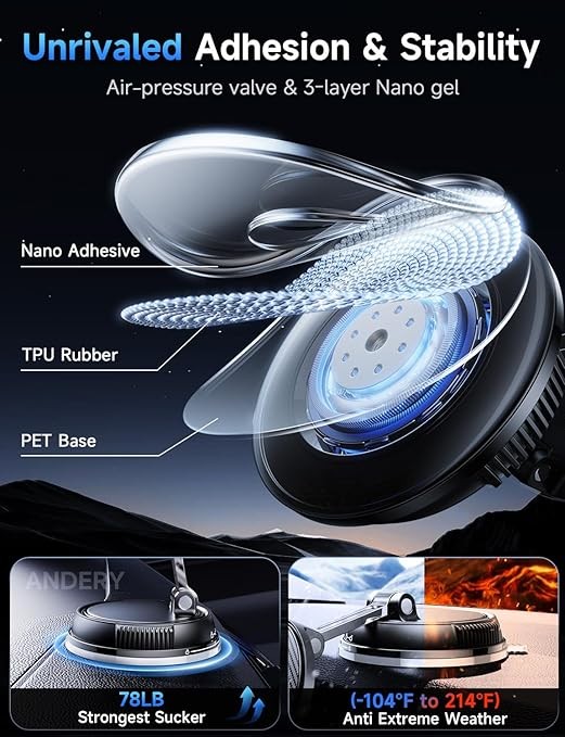 Strong Suction & Stable Hold:This car phone mount uses advanced rotating-lock vacuum suction, boosting suction by 45% compared to traditional press-on mounts. It stays stable on bumpy roads or during sudden stops. The 3-layer high-strength nano gel suction cup supports up to 78lbs and holds firm in extreme temperatures (-104°F to 214°F). It offers reliable support you can trust on the road.