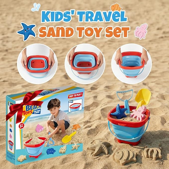Foldable & Space-Saving Design This collapsible beach toys set includes a foldable sand bucket that expands instantly for play and folds flat to a slim size—taking up minimal space in suitcases or car trunks. Ideal travel beach toys for family beach trips, weekend getaways, and summer vacations.