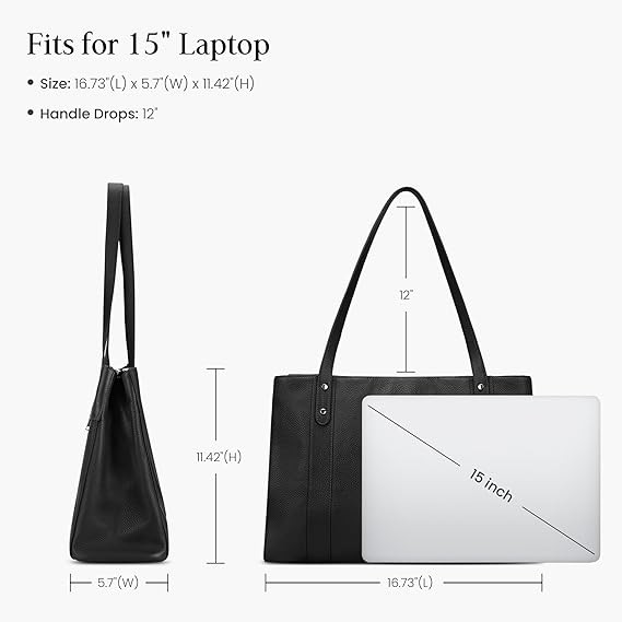 Perfect Size Tote Bag: Tote Measuring at 16.73(L) x 5.7(W) x 11.42(H) inches, laptop compartment dimensions: 13.3(L) x 1.3(W) x 11(H) inches, fits up to 15 inch laptops, A4 documents, working paper and other daily essentials. The drop length of the wide leather handles is 12", perfect for carrying over the shoulder or hand carry
