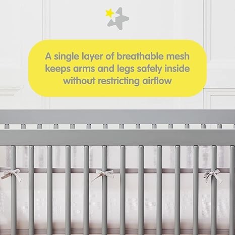 HELPS KEEP ARMS AND LEGS SAFELY INSIDE WITHOUT THE RISK OF RESTRICTED AIRFLOW: A single layer of breathable mesh allows exhaled air to pass through the fabric and mitigates risks associated with padded "crib bumpers" (banned in the US in 2022).