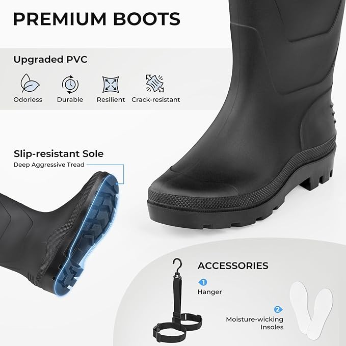 Premium Slip-Resistant Boots: The boots of the Calamus Fishing Waders are made from upgraded PVC material, twice the lifespan of regular waders. Designed for cold weather, they remain flexible and crack-resistant for lasting comfort. The deep aggressive tread pattern provides exceptional slip resistance, enhancing stability on a variety of terrains