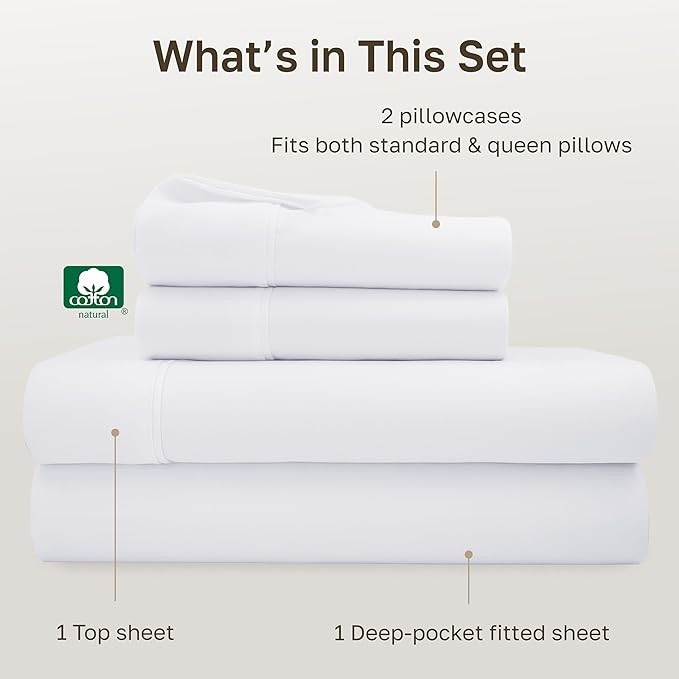 Winner of the 2026 Good Housekeeping Best Bedding Award - Everyday Ease Cotton Sheets: Our 400 thread count queen size bed sheets are made with single-ply 100% long-staple cotton for a smooth hand feel and lightweight comfort. Independently tested to earn the prestigious Good Housekeeping Seal.