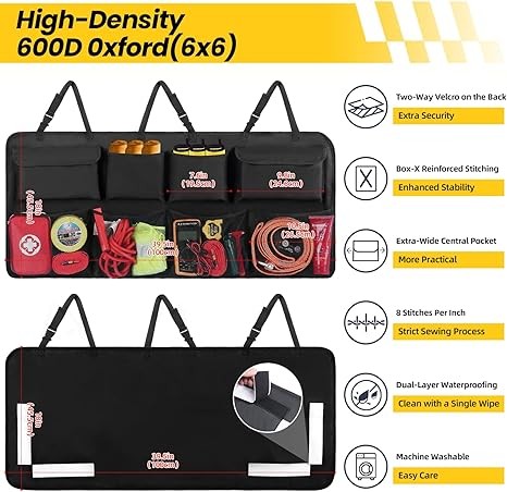 LATEST UPGRADES— Built from heavy-duty 600D Oxford fabric with Box-X Reinforced Stitching and dual-sided Velcro backing, this Trunk Organizer for SUV & Car resists tears and rigidity. As a Backseat Hanging Grocery Organizer for SUV & Trucks, it secures behind seats without slipping. Measuring 39.5 inches in length and 18 inches in width, it provides ample space for keeping your car tidy.