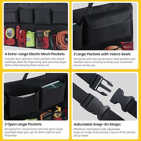 EFFORTLESS INSTALLATION & REMOVAL— Install this Trunk Organizer for SUV & Car in under 3 minutes with three adjustable buckle straps and a secure Velcro base, preventing unwanted movement on bumpy roads. When not in use, simply detach the Backseat Hanging Grocery Organizer and fold compactly for storage in Trucks & Vans.