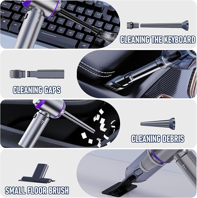 【Powerful 15KPa Suction with 80000RPM Brushless Motor】 Equipped with an upgraded 80000RPM brushless motor, this handheld vacuum delivers 20000Pa strong suction on high mode, efficiently removing dust, debris, pet hair, and crumbs from car interiors and home surfaces. The brushless design provides higher efficiency, longer lifespan, and lower noise (<70dB) compared to traditional brushed motors.