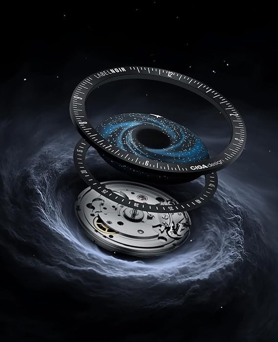 CIGA Design Asynchronous-Follow Movement Technology: Revolutionizing traditional movement gear ratios, this innovative mechanism features a stationary hour dial paired with a dynamic minute dial on the same plane. In this unique configuration, the hour hand moves through a 30° arc while the minute hand completes a 390° rotation, allowing time to be indicated from a single reference point.