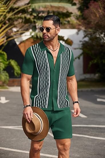 STYLE & DESIGN: Men's short sleeve knit shirt is designed with turn down collar, knit textured vintage contrast design, button closure stylish summer casual shirts. The beach shorts features elastic drawstring waist, two slant pockets and one back pocket perfect for storing phones, sunglasses or gadgets. The men's short set 2 piece are the perfect mix of classic shape with current style.