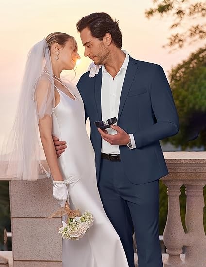 【Classic Fit Suits】Mens 2 piece suits features a notched lapel, two-button closure, 1 inner pocket,four button cuffs with one chest pocket, 2 flap pockets, rear vented and soft padded shoulders.Suit Pants:flat front design, an invisible zipper, elasticated bands, 2 slanted side pockets and 2 back button pockets.