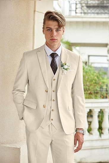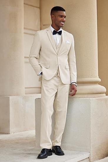 【3 Piece Suits】- 2 button blazer regular fit, lapel tuxedo, 2 front flap pockets and 2 inner pockets, four button cuffs with one chest pocket, naturally shaped and soft shoulder pads. Flat front design suit pants with elasticated bands, zipper design, mens suit vest with five buttons, two side pockets, v-neck, classic suit for men