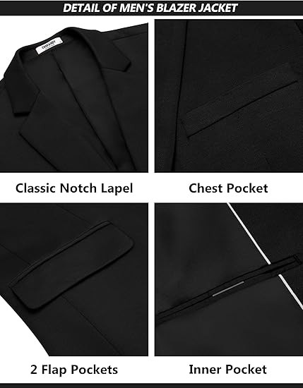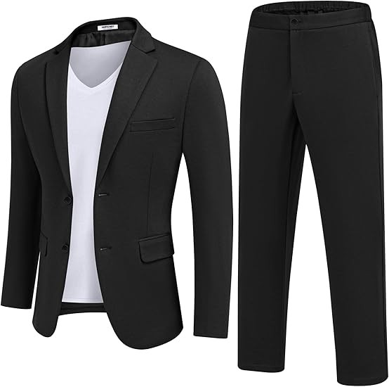 2 Piece Suits Design: 2 button slim fit suit jacket with 2 flap pockets, 1 chest pocket and 1 inner pocket. Notch lapel, four button cuffs, center back vent. Classic blazer makes you look sharp and stylish. Flat front pants with elastic back waist. Zip fly, adjustable drawstring to fit the waist. Straight fit dress pants with 2 side pockets and 2 back pockets.