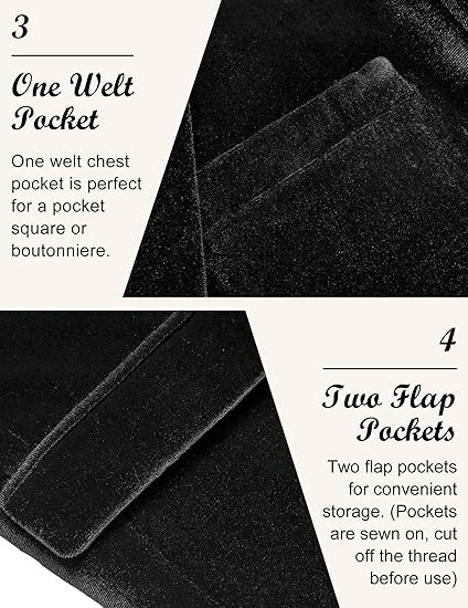 FUNCTIONAL POCKETS - This velvet blazer jacket features one welt pocket at chest height and two flap pockets at waist height(Pockets are sewn on, please cut off the thread before use), easy to hold small items like earphone, wallets, keys, coins and so on.