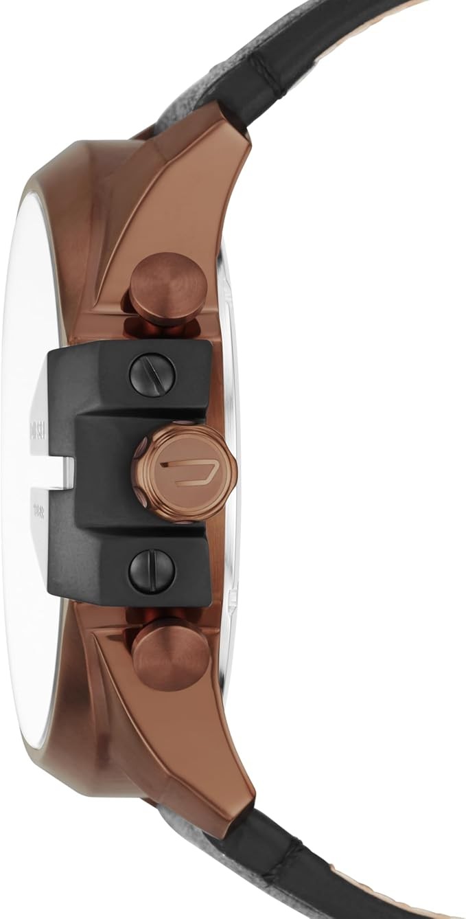 CASE & DIAL: These Diesel watches for men feature a 51mm diameter, round stainless steel case with a black dial and unique crown guard, and a mineral crystal face that resists scratches
