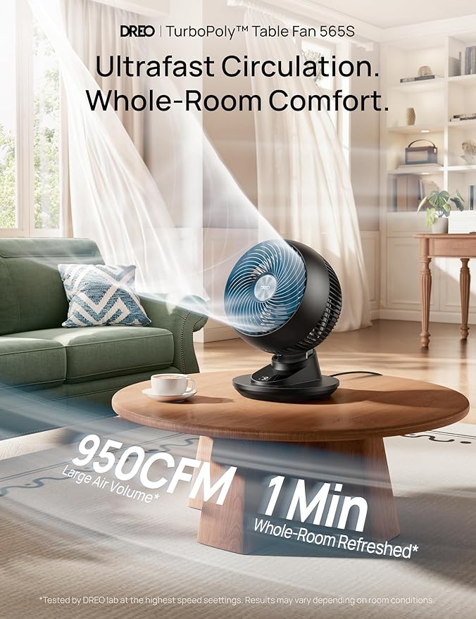 ?????-???? ??????? ?????: TurboWind tech ensures whole-room circulation, delivers up to 950 CFM airflow and sends air up to 85 ft, cooling room in 1 min, ideal for home or office(Table Fan 565S)