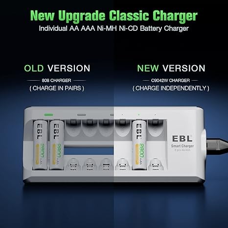 Rechargeable Batteries Charger: EBL upgraded individual charger for aa aaa rechargeable batteries, freely working for 1-8 Ni-MH Ni-Cd Double aa and triple aaa rechargeable batteries.