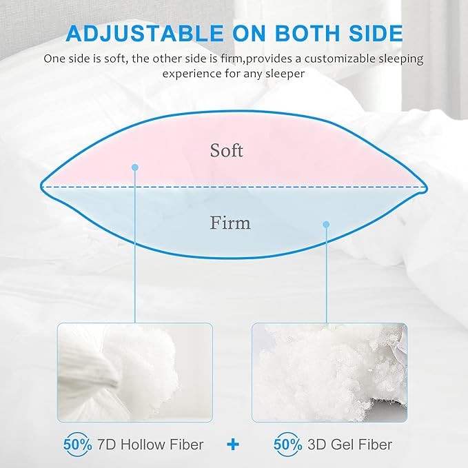 Balanced Comfort: The filling of the pillow consists of 50% Hollow Fiber and 50% Gel fiber, which provides a great balance of supple softness and plump firmness. The bed pillow is supportive enough and excellent for a back, side or stomach sleeper.