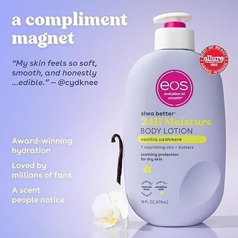 • SUSTAINABLE SKIN CARE: Protect and moisturize your skin with eos shea butter Body Lotion with 7 nourishing oils + butters, including natural shea butter and shea oil. Our collection of incredible fragrances will delight and last all day on skin