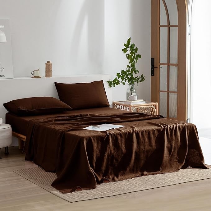 EVERLY Linen Sheets Set King Size,100% French Stonewash Pure Linen Bed Sheets,4Pieces (1Flat Sheet,1Fitted Sheet,2Pillowcase) Suitable for Hot Sleepers,Deep Pocket Natural Bedding Set-Chocolate