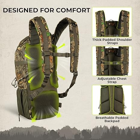 • All-Day Comfort & Stable Carry – A breathable padded back panel, thick padded shoulder straps, and adjustable straps help stabilize the load, reduce pressure points, and keep you comfortable through long hikes, steep terrain, and all-day setups.