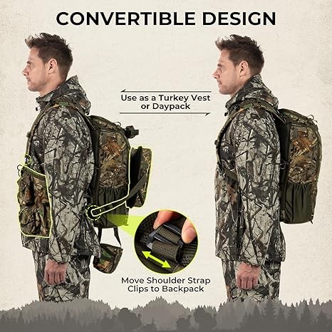 • True Convertible Vest-to-Daypack System – Remove the seat and the waistband (with pockets), then attach the shoulder straps directly to the backpack section for a streamlined daypack—ideal for scouting, run-and-gun turkey hunting, and covering ground when you don’t need the full vest layout.