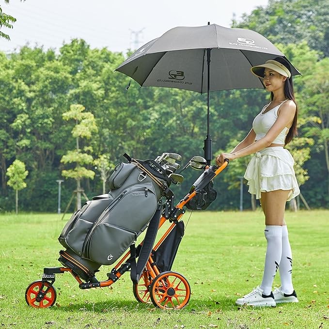3 Wheel 360 Rotating Front Wheel Golf Push Cart: The cart with a front swivel wheel that rotates a full 360 degrees. Lightweight and durable design, Super sturdy and durabiliy ! The front wheel can automatically adjust direction according to different terrain !Traction and parking smoother !