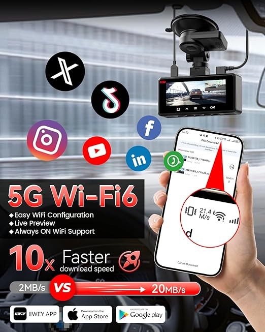 WI-FI 6 TECHNOLOGY: INSTANT ACCESS IN SECONDS - Stop waiting for slow downloads. Equipped with 5G Wi-Fi 6, the Q7 delivers transfer speeds up to 20MB/s—400% faster than standard dash cams. Quickly preview, download, and share your road trips or incident clips to your phone via the App without the frustration of lagging or buffering.