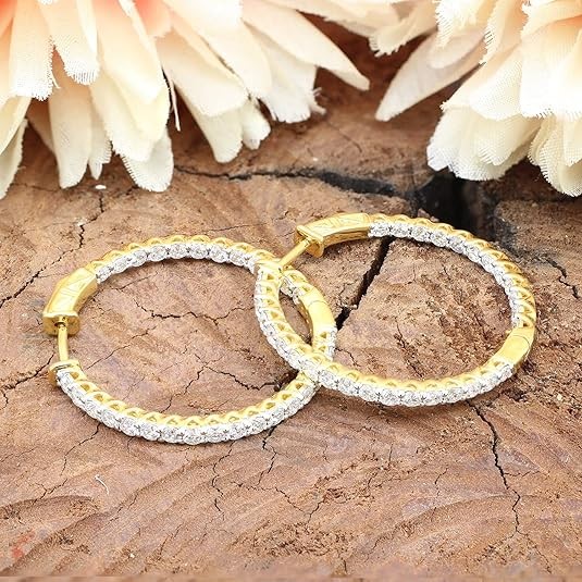 These elegant inside out hoop earrings for women feature round lab created moissanite or lab grown diamonds set along both the outer and inner curves, offering maximum brilliance from every angle. A timeless jewelry design that adds sparkle and sophistication to any outfit, these gold plated hoops make a stylish statement for weddings, parties, or everyday wear. Classic and modern, they’re perfect for women who love bold yet versatile fine jewelry.