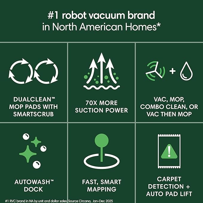 STRONG SUCTION SERIOUS MOPPING. Devours messes from crumbs to pawprints with 70x more suction*, DualClean Mop Pads, SmartScrub, a multi-surface rubber brush, and edge-sweeping brush *As compared to Roomba 600 series robots