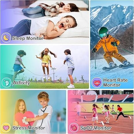 ✅【24/7 Health & Safety Guardian】The most advanced kids fitness watch monitors heart rate, blood oxygen, stress, and sleep (light/deep stages) with a 2,000+ pediatric database. Instant vibration alerts flag health risks and prompt sedentary/drink water reminders. In emergencies, children can press and hold the side button for 3 seconds to activate the SOS alarm—alerting nearby people for immediate help.