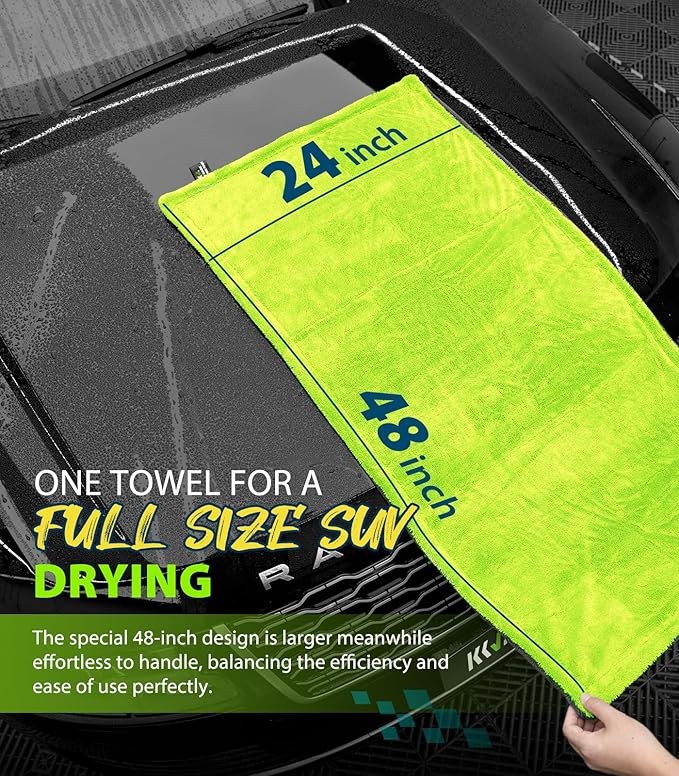 48” Oversized Excellence for Whole SUV: Boasting a 48x24-inch size—larger than the standard 35x24-inch towels on the market—our microfiber towel offers superior coverage and drying efficiency. Easily dry a full-size SUV without the need for wringing, making your cleaning routine faster and more effective