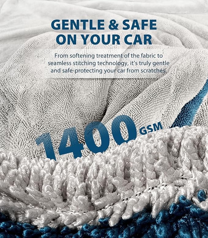 • Twisting Yarn Absorption Technology: Harness the power of 1400GSM (grams per square meter) ultra-fine microfiber with our innovative twisting yarn structure. Capable of absorbing up to 1 gallon of water, this towel guarantees a streak-free, spotless finish, leaving your car’s paint gleaming like new