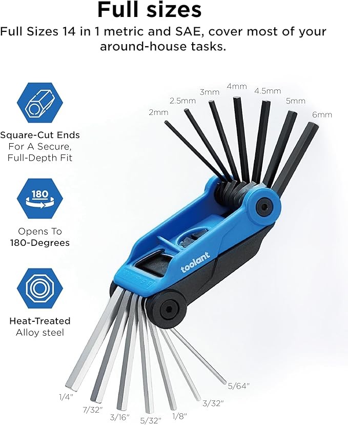 Every Size You Need: Includes 14 different sizes. 7 SAE Allen Keys Sets: 5/64”, 3/32”, 1/8”, 5/32”, 3/16”, 7/32”, 1/4"and 7 Metric hex keys: 2mm, 2.5mm, 3mm, 4mm, 4.5mm, 5mm, 6mm