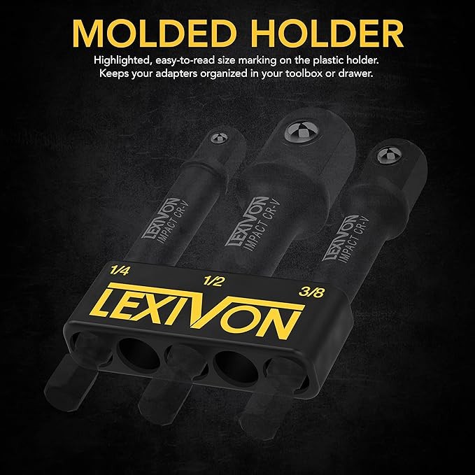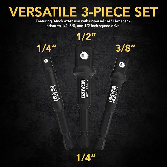 LEXIVON Impact Grade Socket Adapter Set, 3" Extension Bit With Holder | 3-Piece 1/4", 3/8", and 1/2" Drive, Adapt Your Power Drill To High Torque Impact Wrench (LX-101)