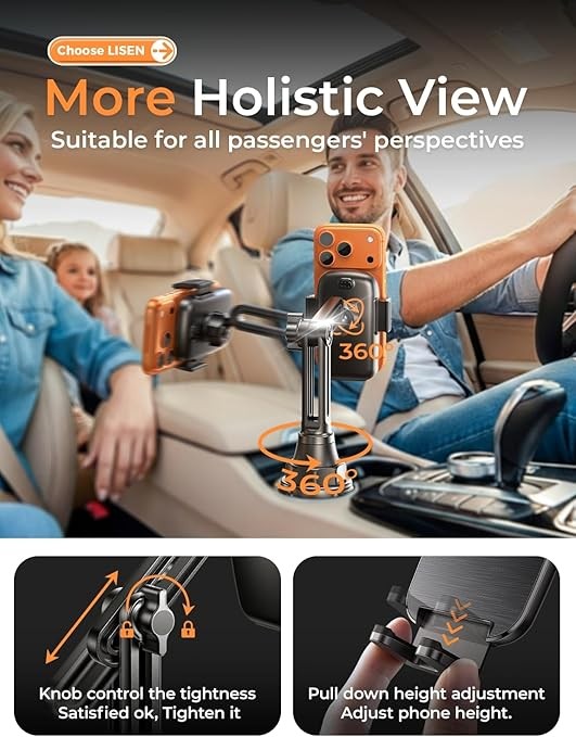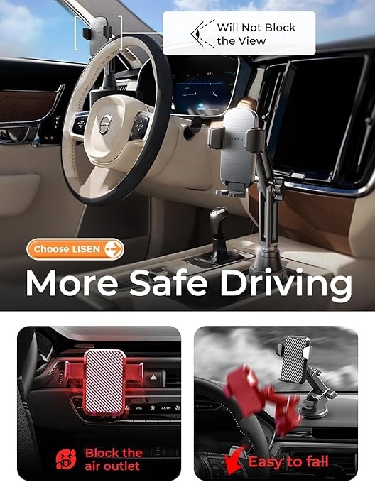 [3ND GENERATION]: LISEN is committed to addressing your feedback on our previous generation car cup phone holder. We understand that customers need to adjust the use distance from front to back in actual use, and that the base is too big for a smaller car cup holder. We have upgraded a new mobile phone holder for your car, The base can adapt to smaller car cup holders. And which has more directional adjustment stiffeners, stronger clamping arms, and a larger and more stable base. We have upgraded the innovative car cup mobile phone holder. Compatible with 99% of cars: BMW, Ford, Toyota, trucks, golf carts,Pickup truck, etc