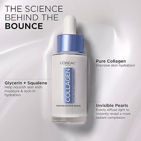 L'Oreal Paris Collagen Moisture Filler Moisture Bounce Face Serum, Glow Serum with Collagen, Glycerin, and Squalane for Bouncy, Radiant, Hydrated Skin, Includes Sample