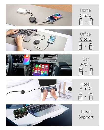 ⚡【5 IN 1 Multi Charging Cable for Travel Essentials】: MINLU Cost-Effective 5 in 1 multi usb cable can satisfy multiple charging demands and PHONE STAND FUNCTION for you. Offers 5 different connectors combination: C To L Port ( PD 27W), C To C Port (PD 60W), A To C Port, A To L Port and USB to USB C adapter. Easy to switch between USB C/ Lightning/ USB A Ports. Available anytime, anywhere. Hot-plug supported. You can carry this retractable multi charger cable anywhere, perfect for travel or sharing with friends.