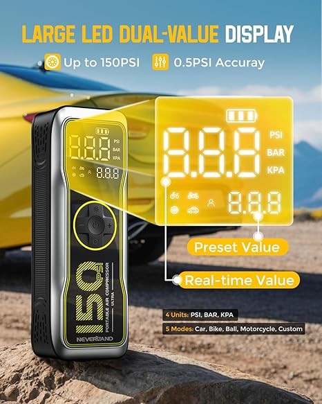 NEVERLAND Tire Inflator Portable Air Compressor - 16000mAh 150PSI Air Pump for Car Tires with Large LED Display,12V DC Tire Inflator with LED Light,Auto shut-off, for Car Motorcycle Bicycle Balls