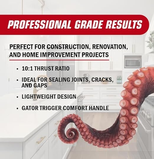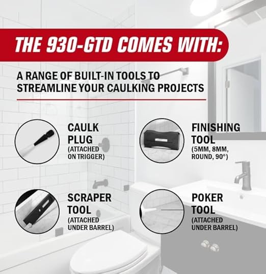 EXTRA TOOLS INCLUDED FOR VERSATILITY: The Octogun 930-GTD comes with a range of built-in tools to streamline your caulking projects. Use the attached scraper tool to remove old material and for easy surface preparation, the 4-sided finishing square to make your caulk bead look professional, the spout cutter for efficient cartridge opening, and the seal puncture tool to get your caulking started right away.