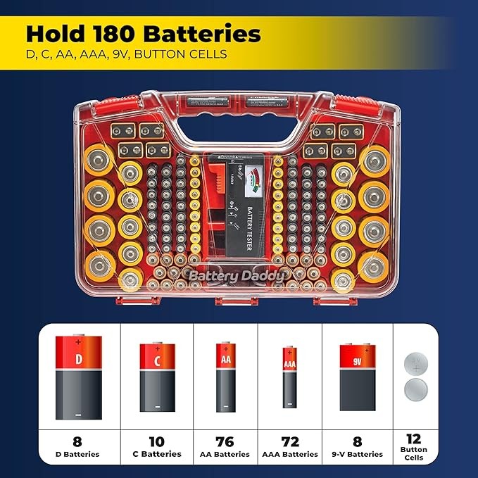 Sleek and Compact Design: Battery Daddy uses both sides to store up to 180 batteries of all types. Holds 78 AA, 64 AAA, 8 9-Volt, 10 C, 12 Coin Cell, and 8 D batteries. Easily stores away in any drawer. Includes Battery Tester