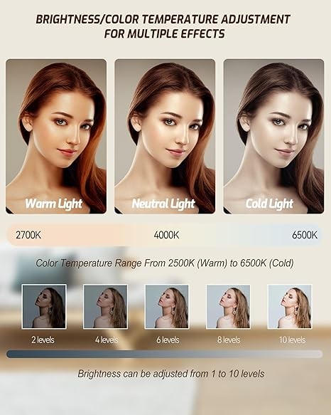 90 LED Best Light Effect: Built in double-layer soft light cover, the light is uniform and soft, avoiding glare; Supports infinite adjustment of color temperature from 2700K to 6500K, with one click switching between cool and warm light, meeting the needs of natural skin tone restoration or atmosphere creation.