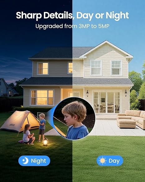 2K 5MP HD Resolution: Capture crystal-clear, high-definition footage, providing much sharper videos than 1080p. Easily identify faces, vehicles, and key details. Equipped with 6 infrared LEDs for clear 33ft night vision, ensuring reliable home security surveillance around the clock.