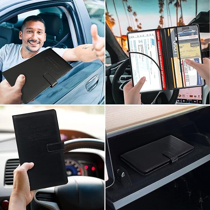 WELL ORGANIZED: The car document holder has been custom made to perfectly keep all of your important documents together. It has multi-function clear compartments which can organize various items very well. Clear and easy to read both documents when you open it up. 1 large pocket for insurance documents and 2 pockets for vehicle registration, 3 small pockets for driver's license, ID cards, AAA cards, business cards, receipt, key contact information cards, etc.