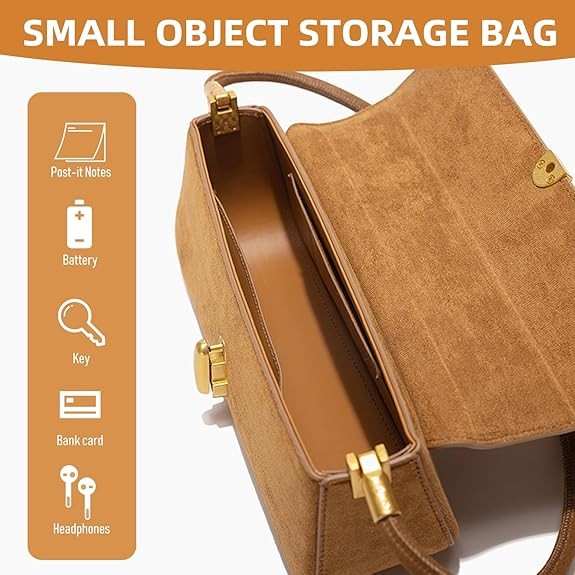 Elegant Design: This stylish handbag features a horizontal square shape and a covered top with a lock buckle closure.Bag size: 10 * 4.3 * 3 inches, moderate size. This versatile and stylish suede bag can be used for travel, shopping, tourism, and leisure gatherings