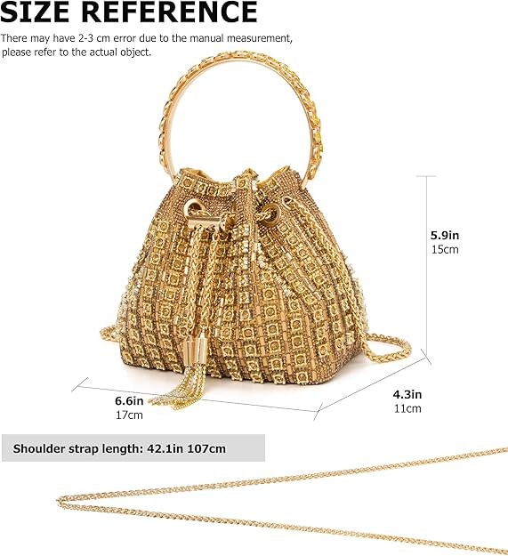 CAPACITY: The size of the Rhinestone purses is 6.69(L)*4.33(W)*5.91(H) Inch. The diamond handbags are roomy enough for most needed items,such as cell phone,cards, money, car keys, small wallet,glasses, compact mirror, lip gloss, powder and a pack of gum.