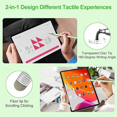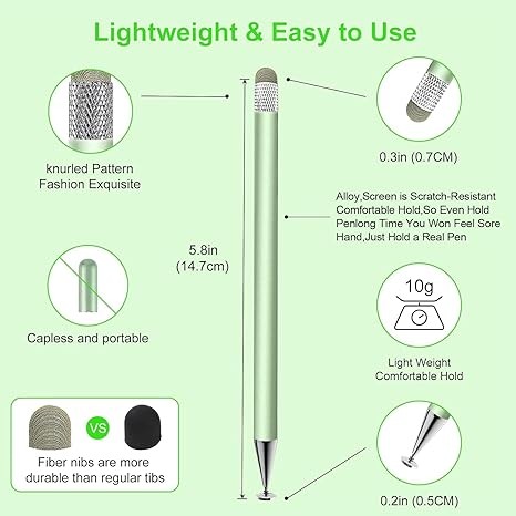 【High Precision High Sensitivity】stylus pen for ipad uses a flexible disc tip that can be flexibly attached to the screen without leaving disconnected lines on the tablet or mobile phone, and the fiber head design is more durable than the rubber head,effectively preventing the screen from being scratched and fingerprinted,transparent disc tip allows you to give the exact position when writing or drawing with the stylus. The fiber head and disc tip can bring you two different touch experiences, ensuring that you are using the stylus for ipad accurately without delay, allowing you to write and draw more smoothly.