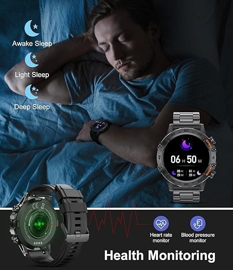 【Multifunctional Smart Watch for Men】Bluetooth voice call rugged smart watches features include social media message notifications and previews,AI voice assistant,blood pressure,blood oxygen,dynamic heart rate,sleep monitoring,alarm clock,calculator, breathing exercises, calorie counting,usiness cards,sedentary reminder,stopwatch,flip wrist light-up,remote camera,music control,weather forecast,multi dial switching,drinkwater reminder,100+ sports modes